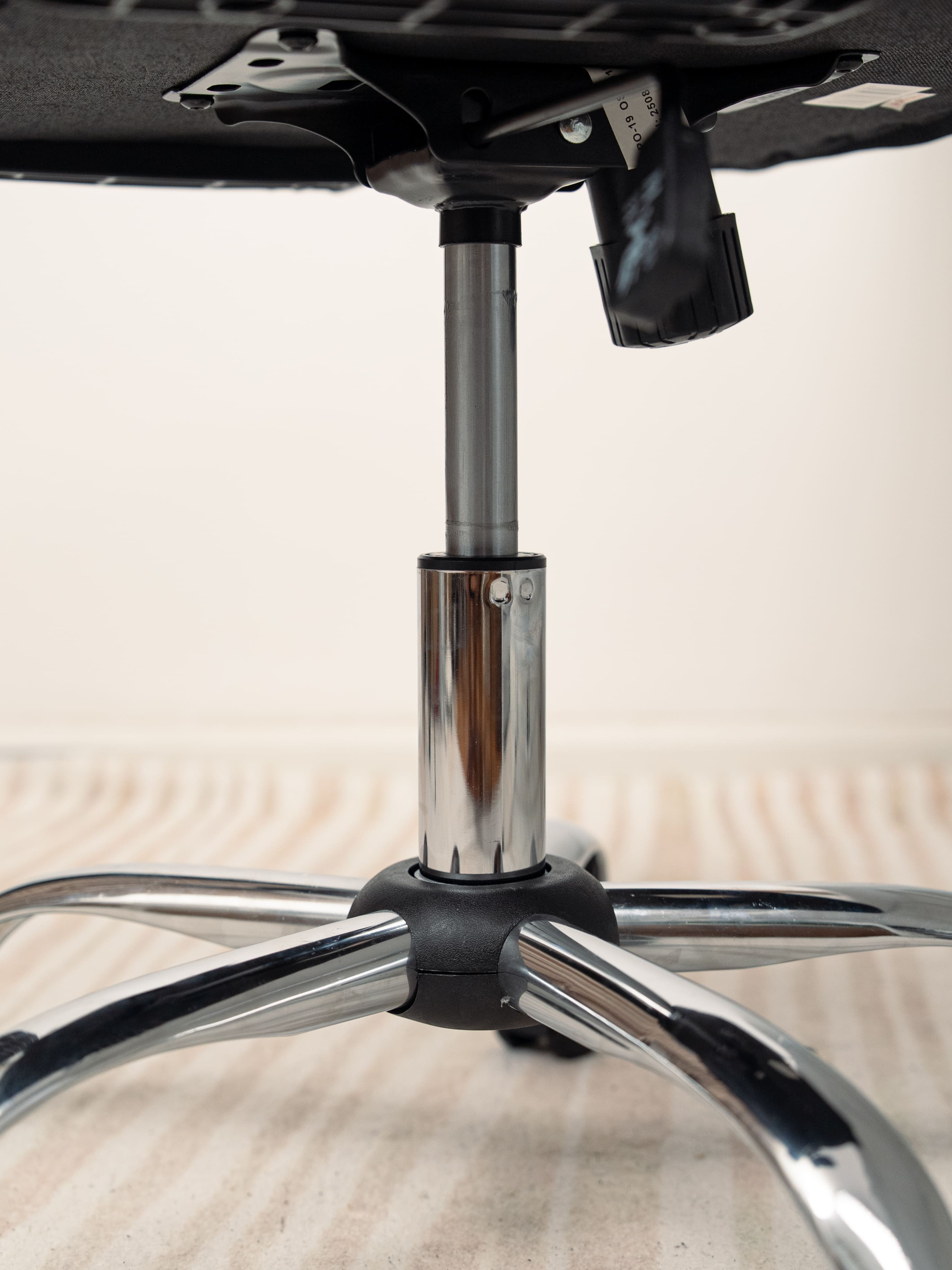 Trụ thủy lực Class 2 giúp điều chỉnh độ cao ghế một cách mượt mà, ổn định và an toàn. Phần chân ghế làm từ kim loại với bán kính 300mm cùng các bánh xe PU chống ồn giúp ghế di chuyển êm ái trên mọi mặt sàn mà không gây ra tiếng động khó chịu.