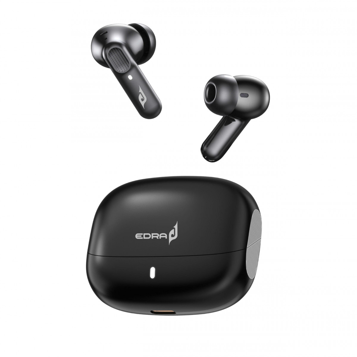 Hộp sạc có kích thước nhỏ gọn (60x50x28.7mm) và trọng lượng nhẹ (51g), dễ dàng mang theo trong túi quần hoặc túi xách. Mặt trên của hộp được khắc logo EDRA tinh tế.
